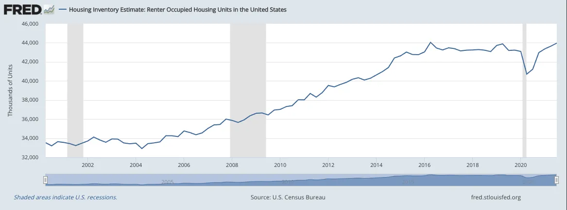 Since its peak in the mid-2000s (see graph below), home ownership has been significantly dropping and it will continue to drop as millennials and the aging baby boomers want to stay mobile in the 21st century.
